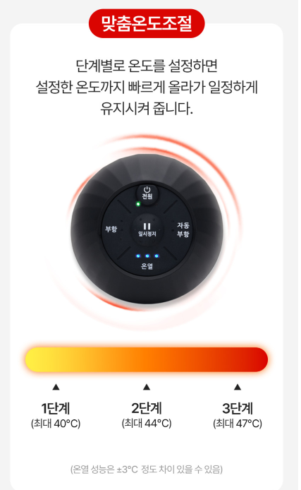 - 3단계 맞춤형 강도와 온도선택 : 세밀한 맞춤 조절 시스템으로 나에게 꼭 맞는 강도와 온도 설정이 가능합니다. 또한 자동부항 모드가 있어 자동으로 반복기능이 가능합니다.