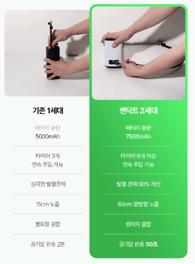 벤딕트 타이어 공기주입기 2세대는 기존 1세대에 비해 배터리 용량이 2,500mAh 증가했으며 타이어를 6개 이상 연속 주입이 가능한 기능으로 발열문제 또한 개선되었다. 60cm의 양방향 노즐을 사용하여 더욱 편리성이 강화되었고 원터치 결합과 공기압 완충시간이 50초로 매우 짧아진 게 큰 특징이다.