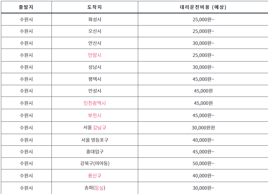 수원 대리운전 가격표