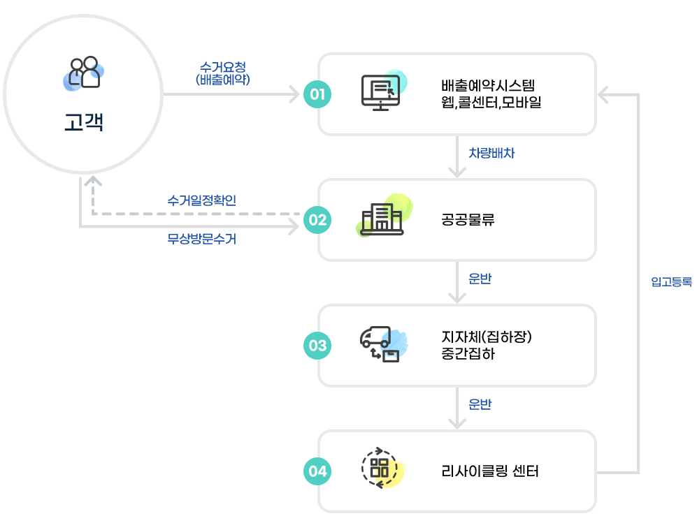 배출자가 예약한 품목을 가정 방문하여 직접 방문 수거하되 배출자의 요청이 있다면 현관문 앞이나 마당 등 앞에서 문전 수거가 가능합니다.