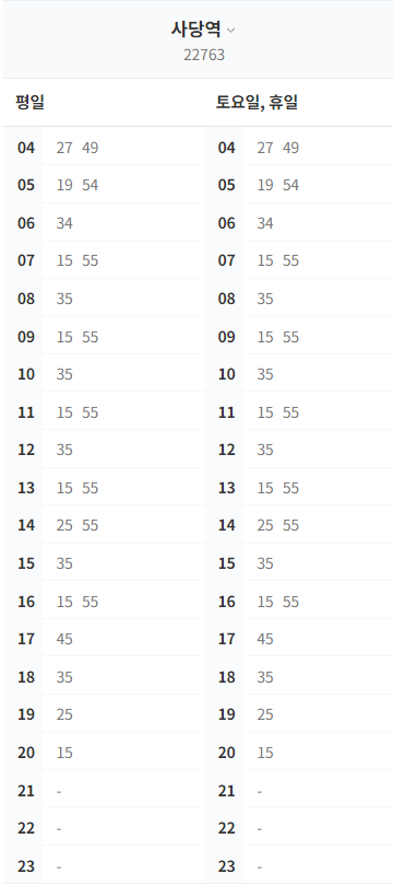 사당역에서 인천국제공항 터미널 1, 터미널 2로 가는 공항버스는 6016번이 있습니다. 6016번의 운행 시간표는 아래와 같습니다.