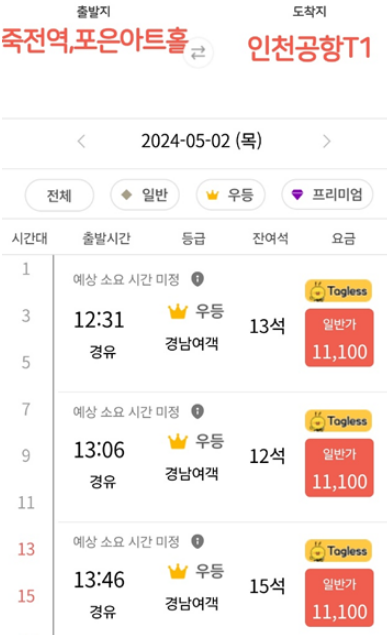 용인에서 인천공항으로 가는 공항버스 탑승 시 사전예약하는 것이 좋습니다. 버스가 우등석이기에 좌석이 많지 않고 배차간격도 30분에 한대이기 때문에 공항까지 원하는 시간에 도착하기 원할 시에 꼭 사전예약을 하시기 바랍니다.