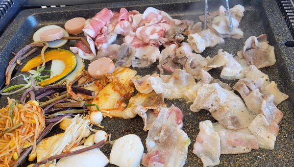 상호명처럼 쌈이 많습니다. 대패삼겹살을 주문하면 샐러드바에서 쌈을 비롯해, 김치, 소세지, 호박, 고사리, 감자, 콩마루, 버섯 등을 무한으로 구워 먹을 수 있습니다. 뭐 남나 싶을 정도로요. 참고로 대패삼겹살 첫 번째 주문은 5인분이 기본이기에 구워 먹으려면 2인이상이 가는 것이 좋고, 그 외 1인 세트메뉴도 있어 혼밥도 가능합니다.