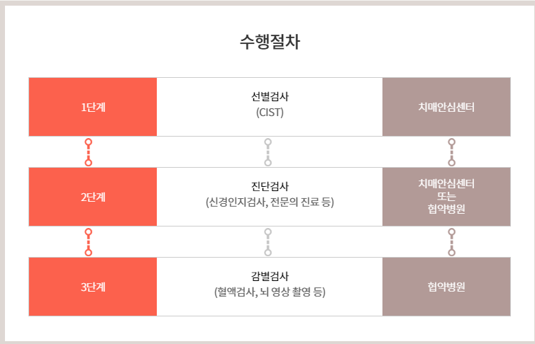 - 치매 감별검사 : 치매안심센터와 협약된 병의원에서 혈액검사, 소변검사, 뇌 영양 검사(2차 치매진단 검사 결과 치매 원인 감별검사가 필요한 자로 비용은 최대 8만~11만 원 지원)