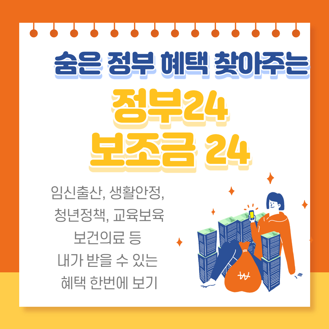 그동안 내가 받을 수 있는 혜택임에도 불구하고 지자체, 부처 등 여기저기 뿔뿔이 흩어져 있어서, 또 무엇이 나에게 해당되는 제도인지 몰라서 찾거나 신청하느라 힘들어서 포기하거나 놓치셨던 분들에게는 희소식인 '보조금 24'를 소개해 드립니다.