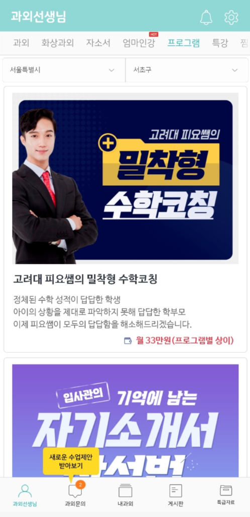 원하는 선생님을 찾아 그 선생님과의 채팅을 통해 간략하게 기본 설명과 상담을 하고 선생님의 성향에 따라 시범과외 등 가 과외 가격이 책정되어 재빠르게 과외를 시작할 수 있고 혹여나 마음에 들지 않는다 하더라도 언짢지 않게 다른 선생님을 구할 수 있으니 급하게 과외 선생님을 찾고 있다면 김 과외를 통해 시작해 보는 것도 좋은 방법인 것 같다.
