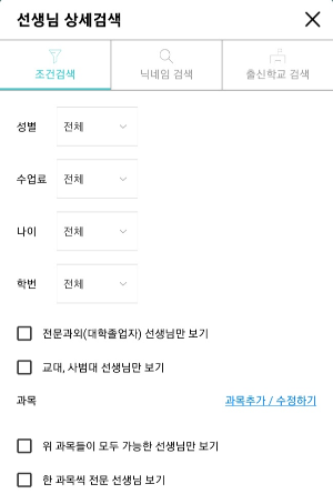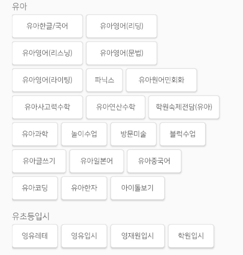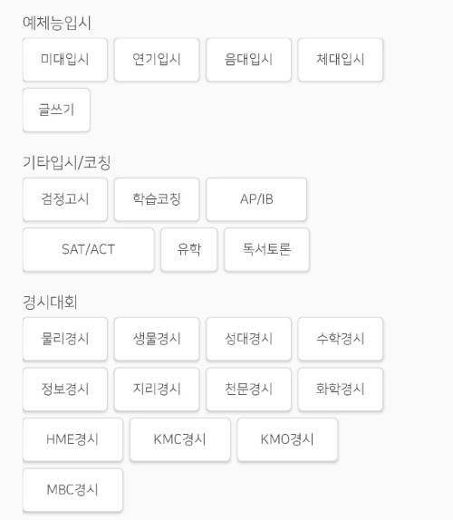 김 과외 어플이 마음에 드는 하나는 원하는 과목을 아주 상세하게 쪼개서 원하는 선생님을 쉽게 찾을 수 있도록 고를 수 있다. 초등학교, 중학교, 고등학교 대상을 선택할 수 있는 것뿐만이 아닌 예체능 입시나 기타 검정고시, 유학, 경시대회 등을 준비할 때 필요한 선생님의 도움을 받을 수 있다.
