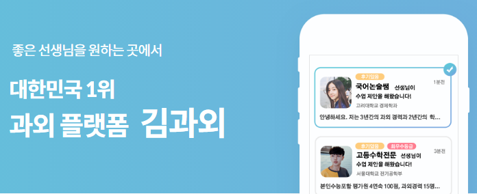 김 과외 어플은 2022년 고객이 가장 추천하는 브랜드 대상을 수상하였다. 과외 선생님을 찾으려고 하면 길이나 동네 홍보 게시물에 붙은 전단지, 지인 소개가 우선이 될 것이지만 이 또한 정보가 한정적이다. 그래서 만들어진 대한민국 1위 과외 플랫폼 김 과외가 나오게 된 것이다.