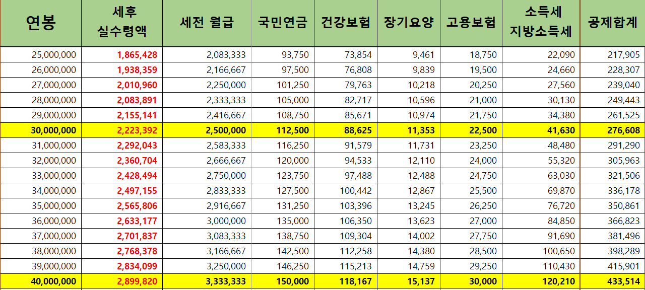 4대 보험을 적용한 2023년 연봉 실수령액표를 보면서 나의 연봉이 대략 어느 정도 되는지 계산해 보시기 바랍니다.