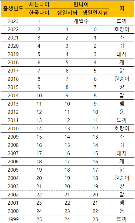 다음은 출생 연도에 따른 한국식 세는 나이와 만 나이를 정리해 보았다. 만 나이는 생일지남과 생일 안지남을 기준으로 계산하였으며 또한 출생 연도에 따른 띠도 알아볼 수 있다.