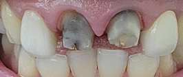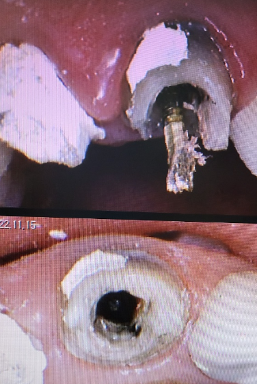 앞니에 심은 기둥인 포스트를 제거 후에 들여다본 앞니는 처참했다. 과거에 아말감으로 때운 자리가 놀아 들어 색이 변질되었고 안은 시커멓게 변해있었다. 앞니 올세라믹을 한 개씩 붙여 넣었더니 틈이 생겨 두 개를 붙여 넣었던 것이 문제가 되어있었던 것이다. 이 끔찍한 상황을 수차례 무려 두 달에 걸쳐 치료하였다.