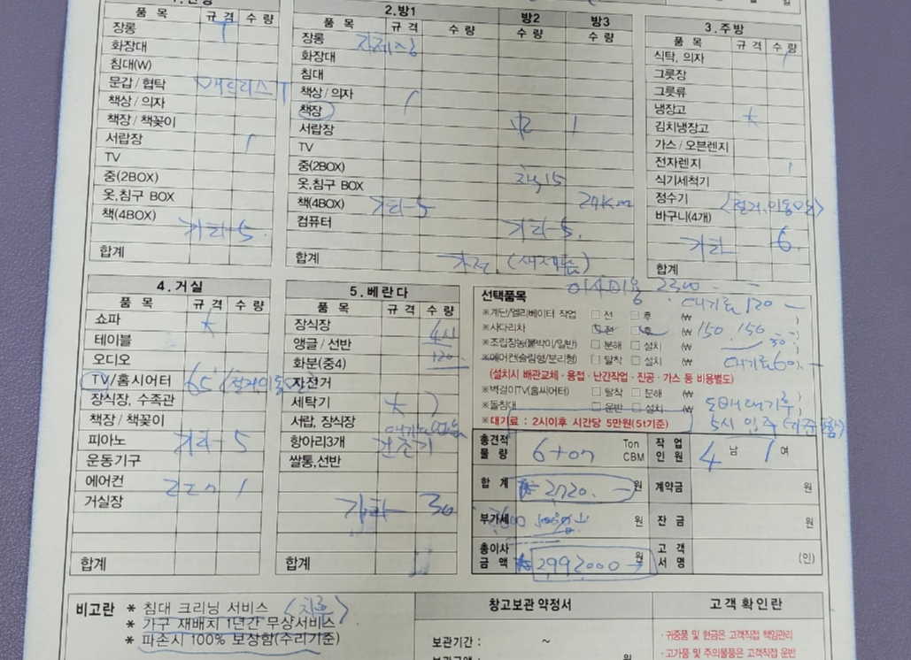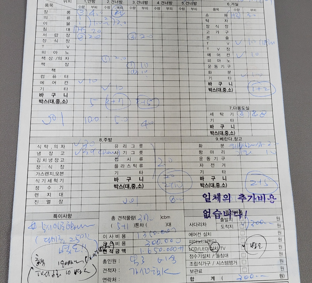 짐을 볼 때 부피를 보는 게 중요한 게 몇 톤 트럭으로 가능할지를 판단하는 것이라 가격이 더 나올까 봐 짐을 숨기거나 숨기면 안 되는 것이 당일 온 트럭에 다 담기지 않으면 낭패이며 추가 차량이 동원되어 추가요금이 나올 것이다. 그래서 견적을 보실 때도 조금은 여유롭게 견적을 내는 것 같다. 신기하게 모든 업체가 견적을 6톤을 잡으셨다.