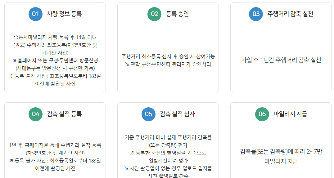 승용차 마일리지 신청방법은 통합에코마일리지 사이트 또는 구청 및 주민센터에서 신청가능며 차량정보(번호판, 계기판 등)를 등록하고 승인받게 되면 가입 후 1년간 주행거리 감축 실천을 등록하여 심사 받으면 최종적으로 감축률에 대한 마일리지를 지급받게 됩니다.