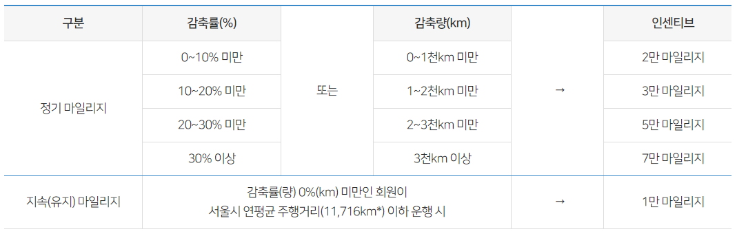 정기(감축) 마일리지는 1년 단위로 주행거리 감축 정도에 따라 2만에서 7만 마일리지까지 차등 지급되고,