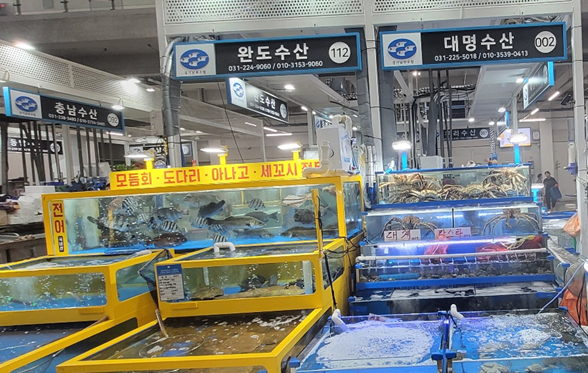 수산물동으로 가면 깨끗하고 신선하게 관리되어있고 가격도 도매이다 보니 저렴하게 느껴집니다. 노량진 수산시장을 자주 가는데 비슷한 가격선에서 이루어지는 것 같습니다. 가을이니 만큼 대하사시는 분들이 많았고 대명수산이라는 곳에서 킹크랩을 많이들 사가시느라 줄이 매우 길더라고요.