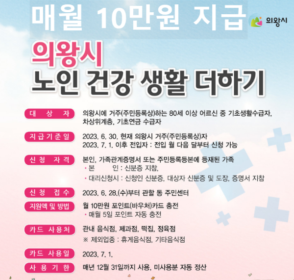 의왕시에서 처음 시행하는 정책에 대상자 분들은 잊지말고 신청하시어 매월 10만 원의 노인 건강생활 더하기 카드 신청 지원금을 받으시길 바랍니다.