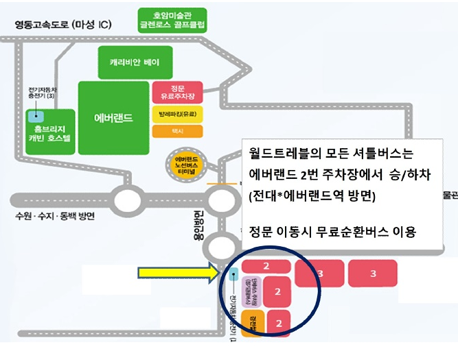 에버랜드로 가는 월드트래블의 셔틀버스는 에버랜드 2번 주차장에서 승하차합니다. 전대 에버랜드역 방면이며 정문으로 이동시 에버랜드까지의 무료순환버스를 이용하실 수 있습니다.