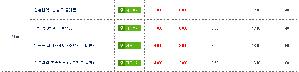 각자 출발하는 시간과 가격, 소요시간이 다르니 꼭 확인하시고 미리 예약 후에 이용하시면 좋을 것 같습니다.