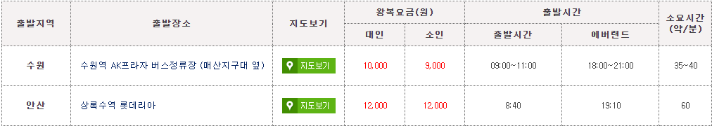 서울지역 외에서 에버랜드까지 운행하는 수원, 안산, 천안셔틀버스의 출발장소, 왕복 및 편도 요금, 출발시간, 소요시간에 대해 알아보도록 하겠습니다.