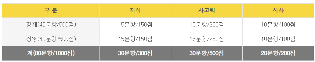 시험문제는 5지선다형으로 출제되며 OMR카드 기입으로 시험을 치르시면 됩니다. 경영, 경제 각 40문항으로 이루어져 있으며 1,000점 만 접으로 배점은 문항별로 상이합니다.