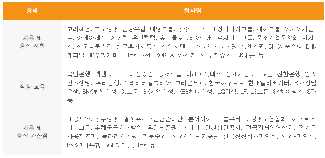 또한 매경 TEST를 채용, 승진시험, 직장교육 등 활용하고 가산점 등을 부여하는 회사들도 점진적으로 늘어남으로써 기업 임직원의 필수 지식과 역량의 판단기준으로 활용하고 있습니다.